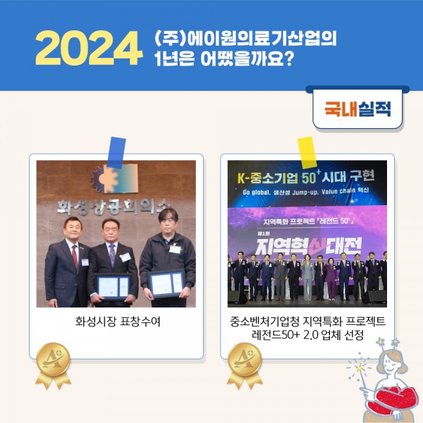 - (주)에이원의료기산업, 중소벤처기업청 지역특화 프로젝트 레전드50+ 2.0 기업 선정